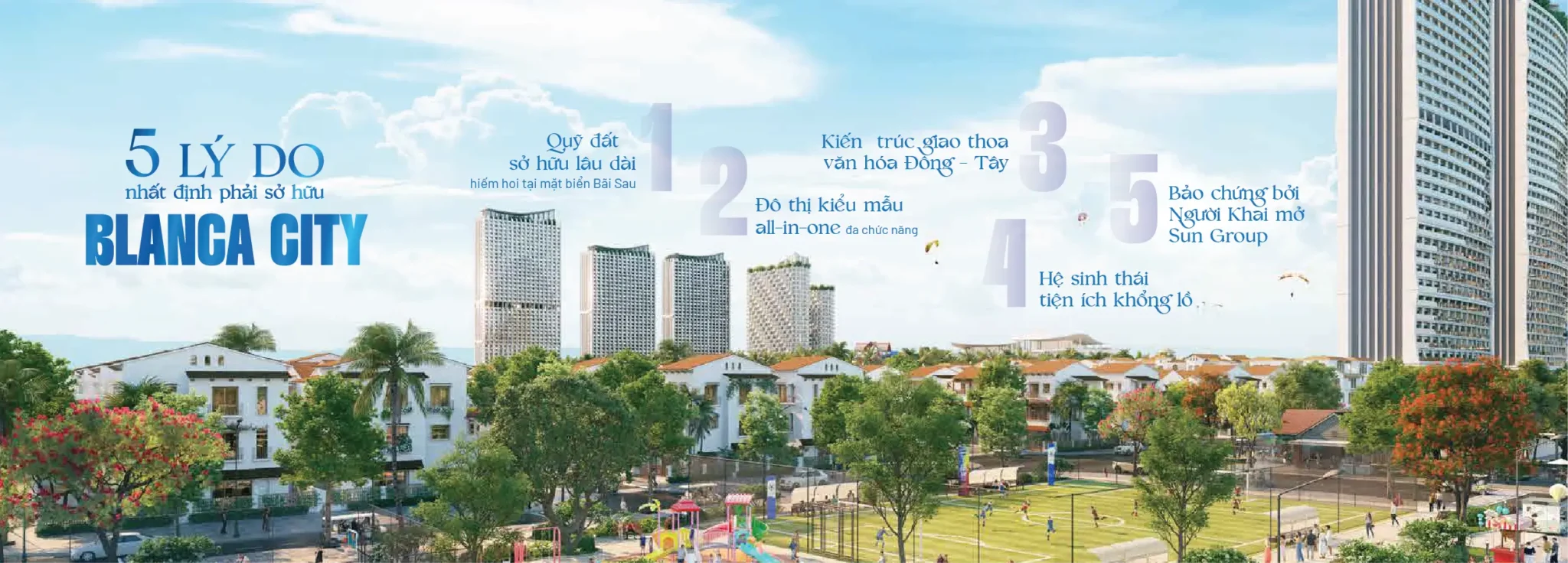 Hệ tiện ích Blanca City như một “vương quốc diệu kỳ” với bãi biển riêng dài gần 1km, hệ thống 9 công viên – nổi bật là công viên Sun World có thể mở cửa buổi tối, điểm nhấn đại lộ Hoa giao thoa Việt – Pháp – Bồ Đào Nha, tổ hợp khách sạn cao cấp vận hành bởi thương hiệu quốc tế, TTTM mặt biển lớn nhất Việt Nam… kết hợp các công trình giáo dục, y tế chất lượng cao trong tương lai