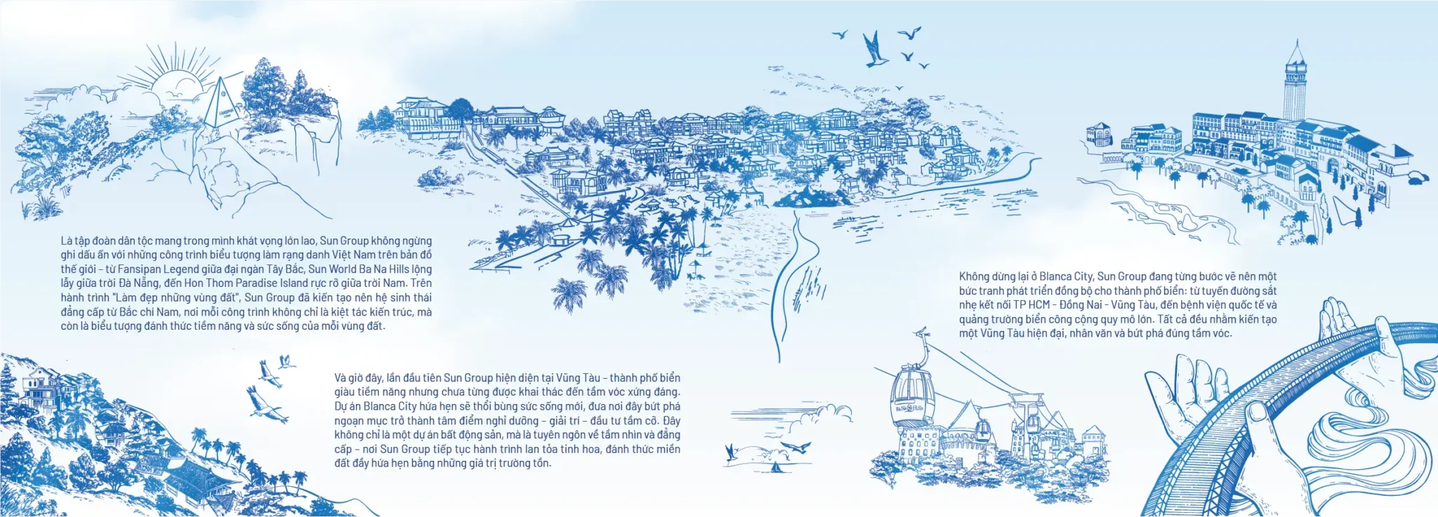 Được kiến tạo bởi Sun Group cùng “bậc thầy” thiết kế vang danh thế giới Aedas, Blanca City là bản hòa ca kiến trúc, nơi ba luồng văn hóa – Pháp thanh lịch, Bồ Đào Nha phóng khoáng và Nam Bộ duy cảm cùng hòa quyện đồng điệu. Ký ức về những hải trình kết nối Á – Âu được tái hiện qua thiết kế nổi bật của những ngôi nhà trắng tinh khôi soi bóng mặt biển Bãi Sau.