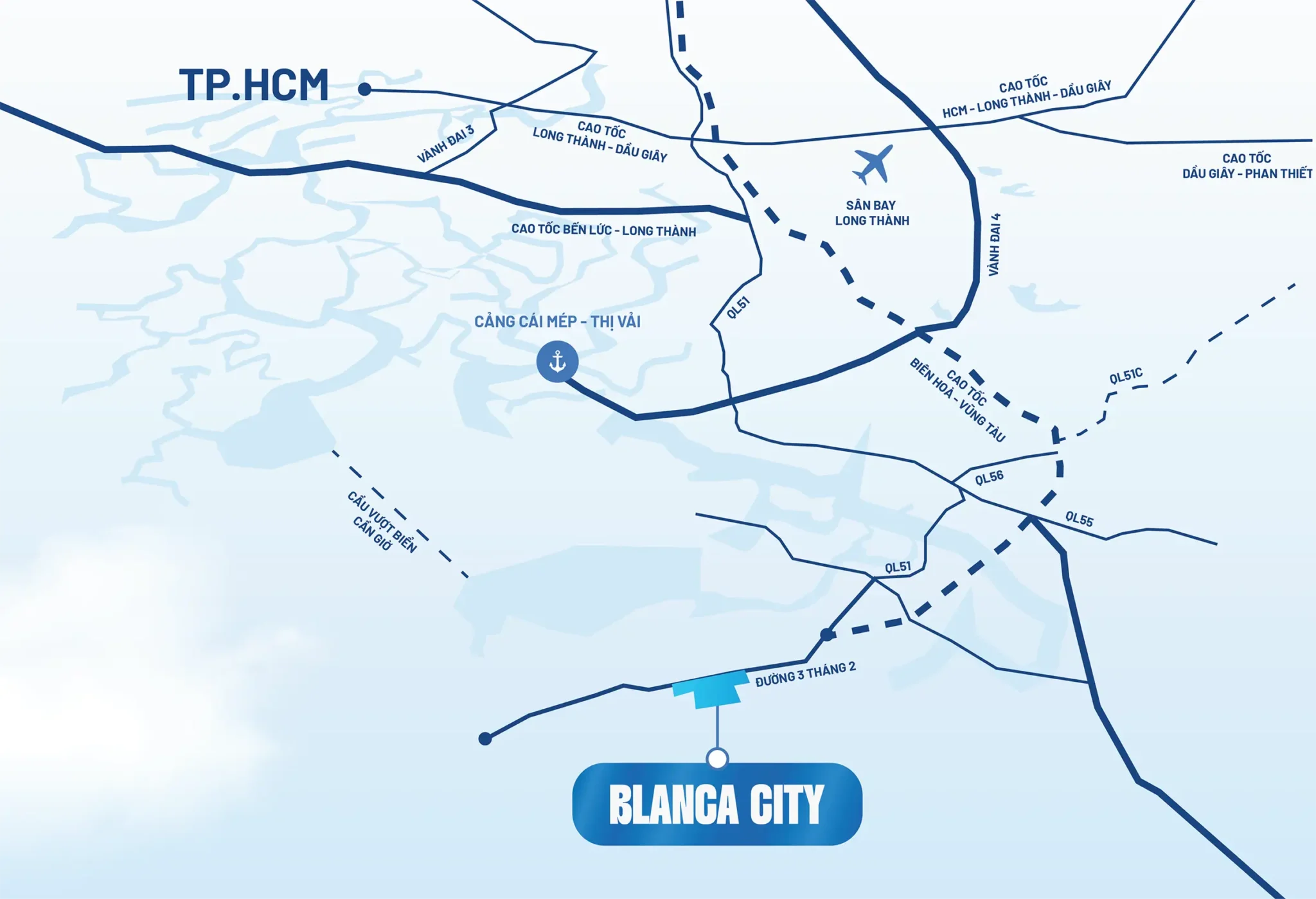 Blanca City sở hữu vị trí đắt giá với hai mặt tiền hiếm hoi: một mặt ôm trọn cung đường huyết mạch 3 Tháng 2 – tuyến kết nối xương sống của thành phố; một mặt hướng ra Bãi Sau, bãi biển đẹp và sầm uất bậc nhất Vũng Tàu. Dự án trải rộng trên quy mô 96,6ha (trong đó bao gồm quỹ đất sở hữu lâu dài hiếm hoi mặt biển) – với tổng mức đầu tư gần 37.000 tỷ đồng – trở thành một trong những đô thị kiểu mẫu đầu tiên và lớn nhất khu vực. Cộng hưởng vị trí trung tâm thành phố, nơi đây hưởng trọn kết nối vàng, đón đầu mọi luồng di chuyển của làn sóng cư dân và du khách từ khắp nơi đổ về.