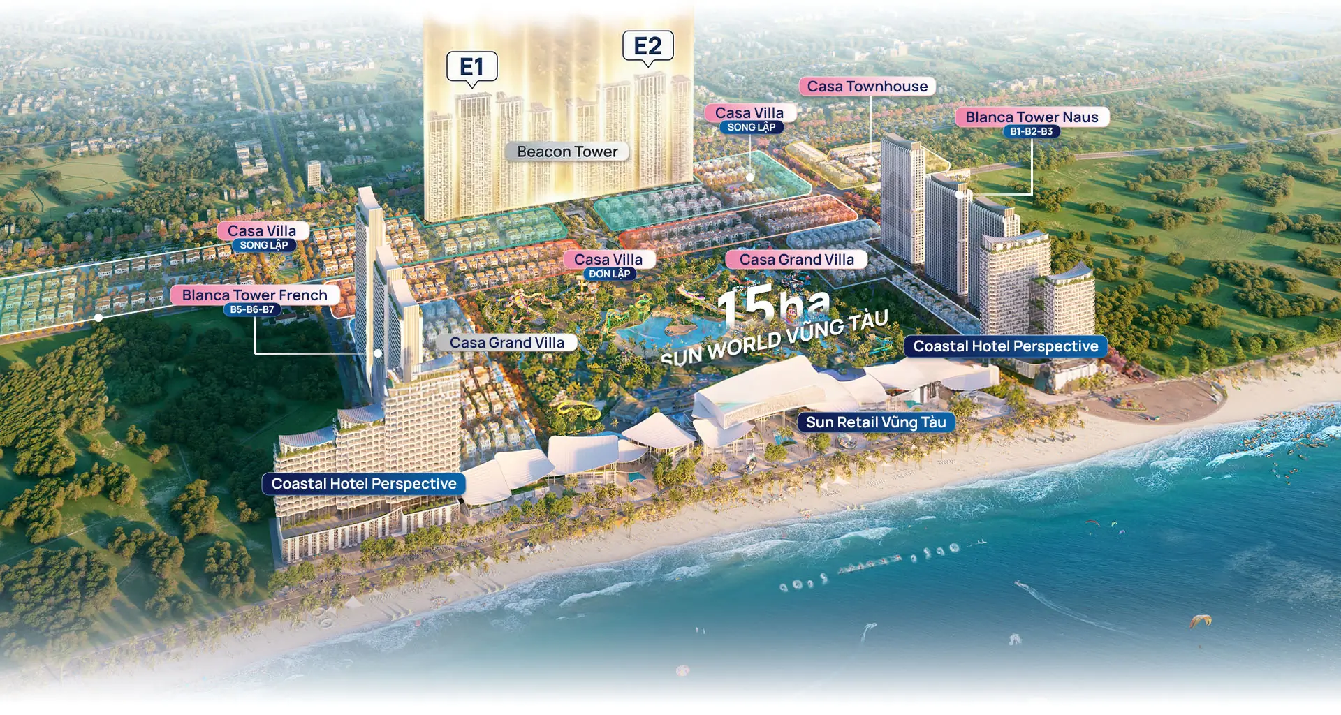 Tọa lạc tại vị trí kim cương ngay trung tâm biển Bãi Sau, Thành phố trắng Blanca City không chỉ sở hữu quỹ đất mặt biển sở hữu lâu dài hiếm hoi, mà còn tiên phong kiến tạo một Đô thị biển kiểu mẫu All-in-one đẳng cấp bao gồm: căn hộ cao cấp; nhà phố liền kề; biệt thự sang trọng; trung tâm thương mại ven biển; chuỗi khách sạn vận hành bởi đối tác quốc tế cùng công viên nước Sun World – biểu tượng vui chơi giải trí hàng đầu cả nước, lần đầu tiên xuất hiện tại Vũng Tàu.